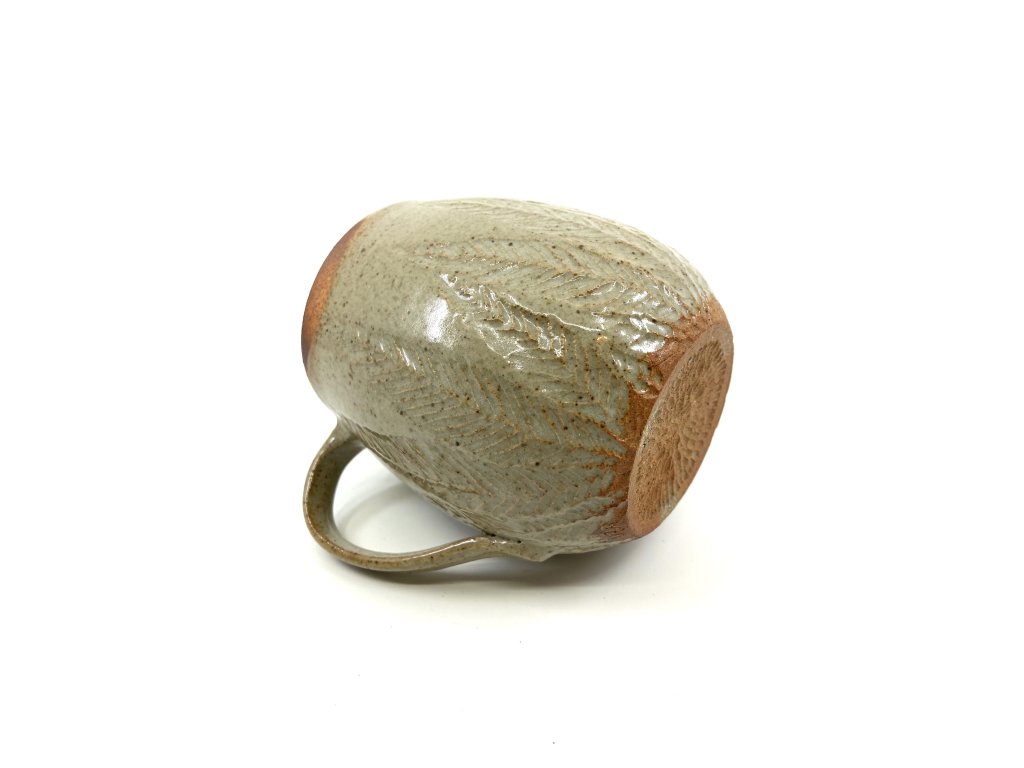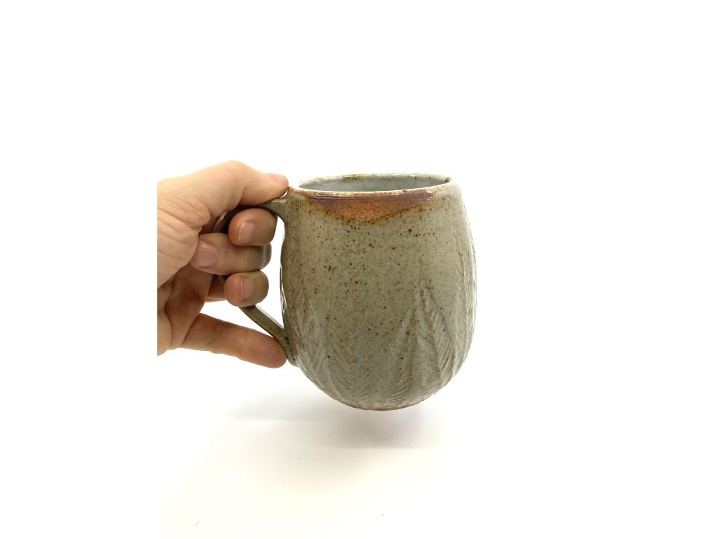 Hrnek je z kameniny Ohnivec, dekorovaný rytím, pálený na cca 1350 stupňů v dřevopeci. Glazován popelovou glazurou. Má místy krásné ožahy od ohně.